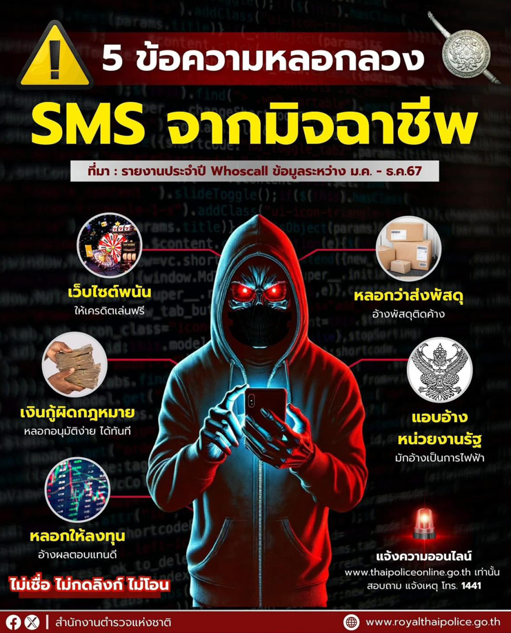 ระวัง 5 ข้อความ SMS ทรงมิจฯ ส่งมาหลอกให้คลิก กดลิงก์ หลอกแชต ลวงให้โอนเงิน เว็บไซต์พนัน หลอกว่าส่งพั
