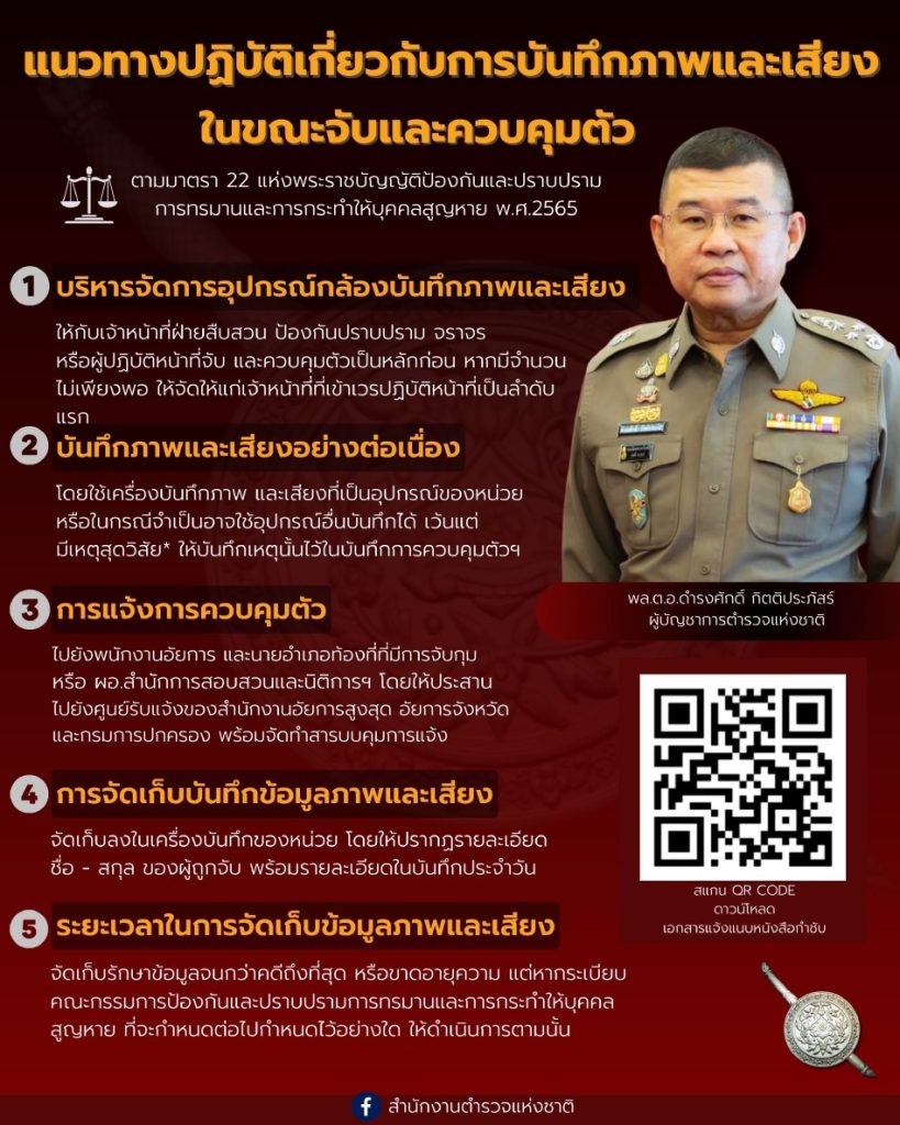- คำสั่ง ตร.ที่ 551/2566 เรื่อง การบันทึกภาพและเสียงในขณะจับและควบคุมตัว การบันทึกข้อมูลเกี่ยวกับผุ้ถูกควบคุมการเเจ้งกรณีที่ผุ้ถูกควบคุมตัวถึงแก่ความตาย และการเเจ้งเหตุแห่งคดีให้พนักงานอัยการทราบ ตาม พรบ.ป้องกันและปราบปรามการทรมานและการกระทำให้บุคคลสูญหาย พ.ศ.2565